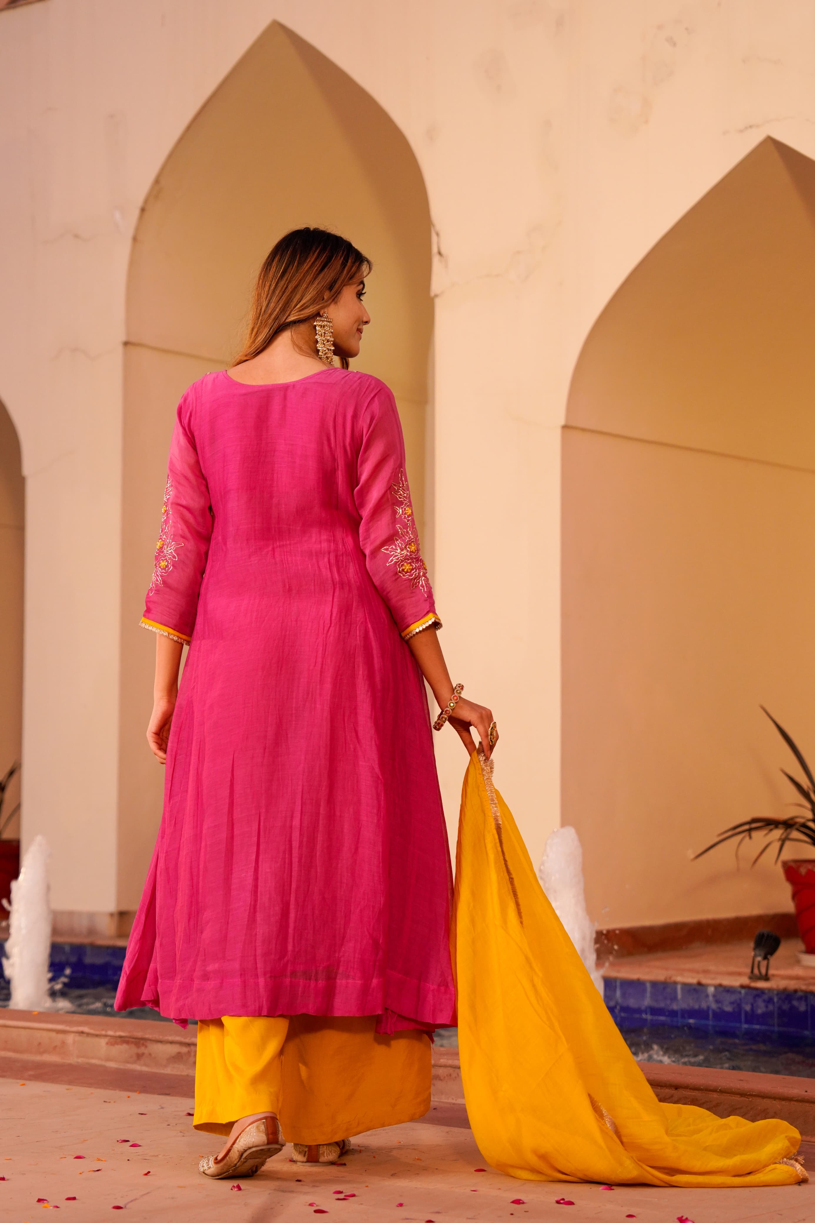 Discover the ideal balance of traditional and elegant design with our Pure Mal Chanderi Suit. This exquisitely crafted suit features delicate handwork that showcases timeless craftsmanship.