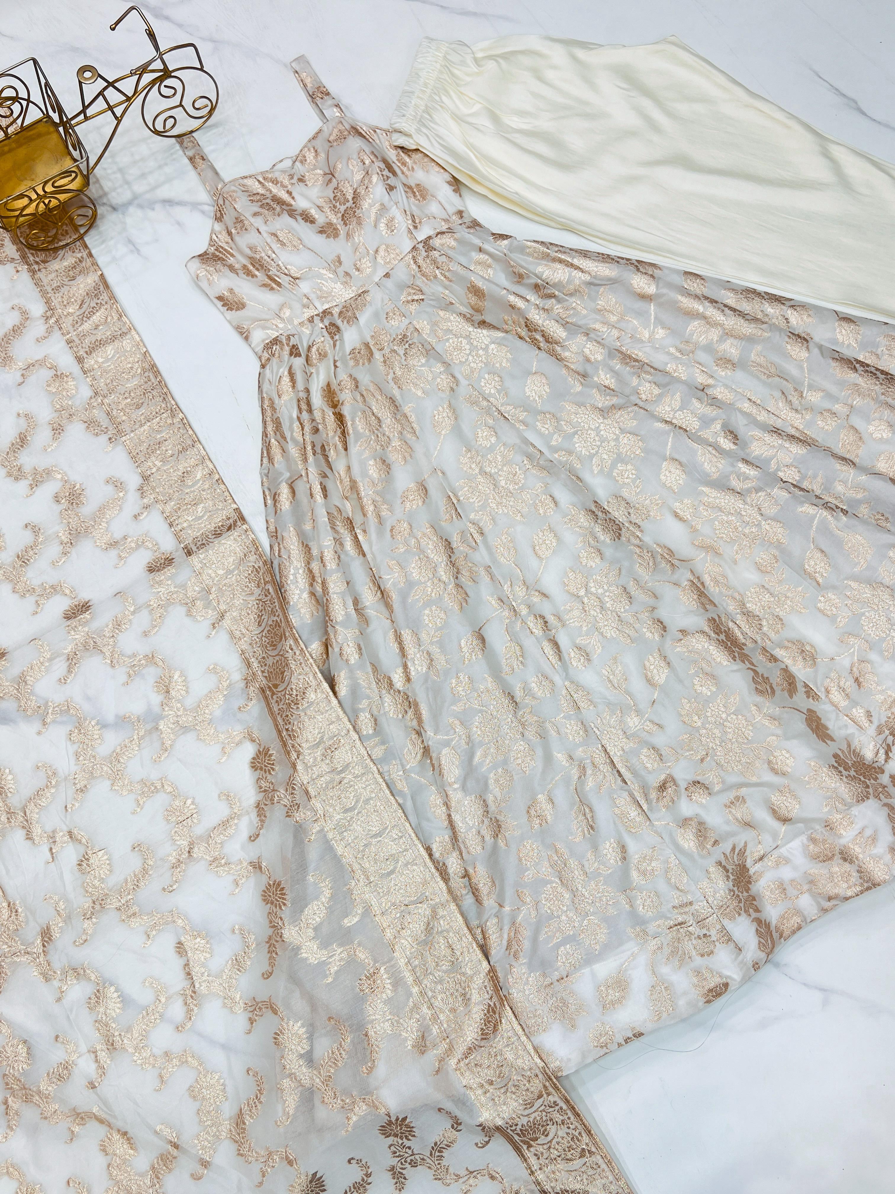 Fully Flared Banarasi Anarkali Gown Set with Dupatta & Pant