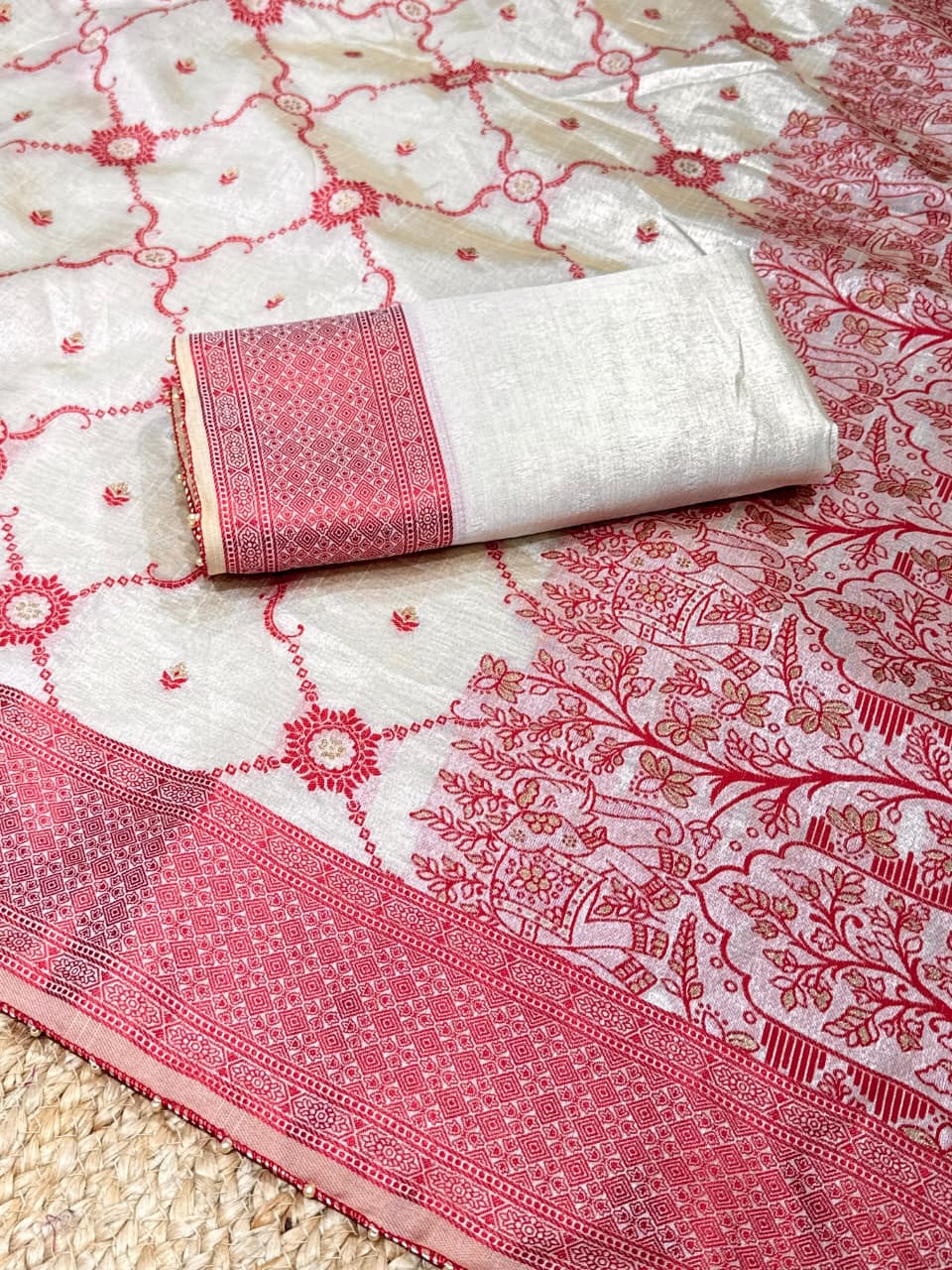 Effortless elegance meets vibrant charm with this designer weaving jacquard saree crafted in premium Tusser cotton. Featuring intricate contrast thread weaving in the pallu and border, this saree showcases detailed jacquard patterns throughout the body with subtle zari touch-up for a refined finish. The pearl work detailing along the border enhances its graceful appeal, making it perfect for festive gatherings, office wear, and special occasions.