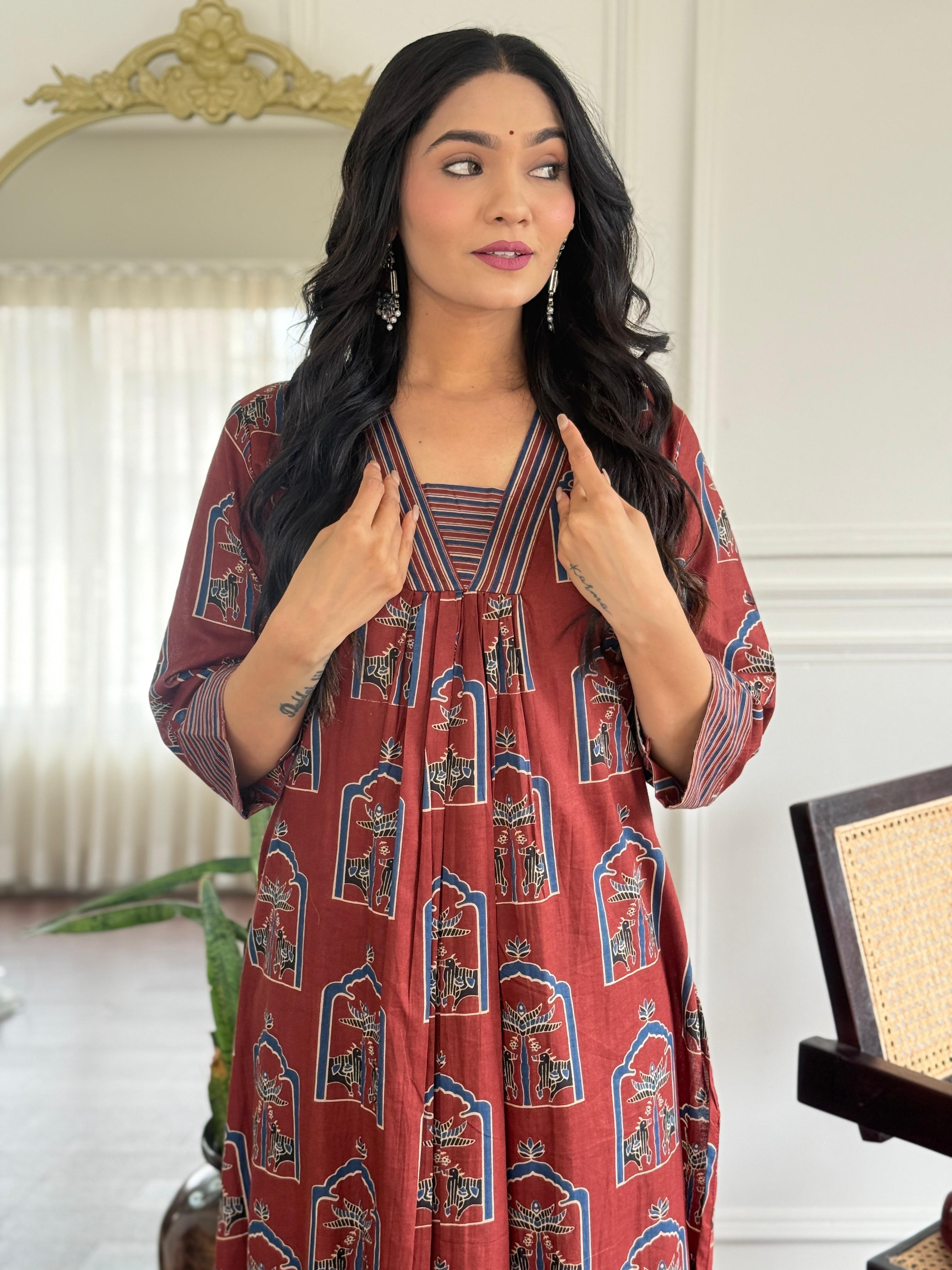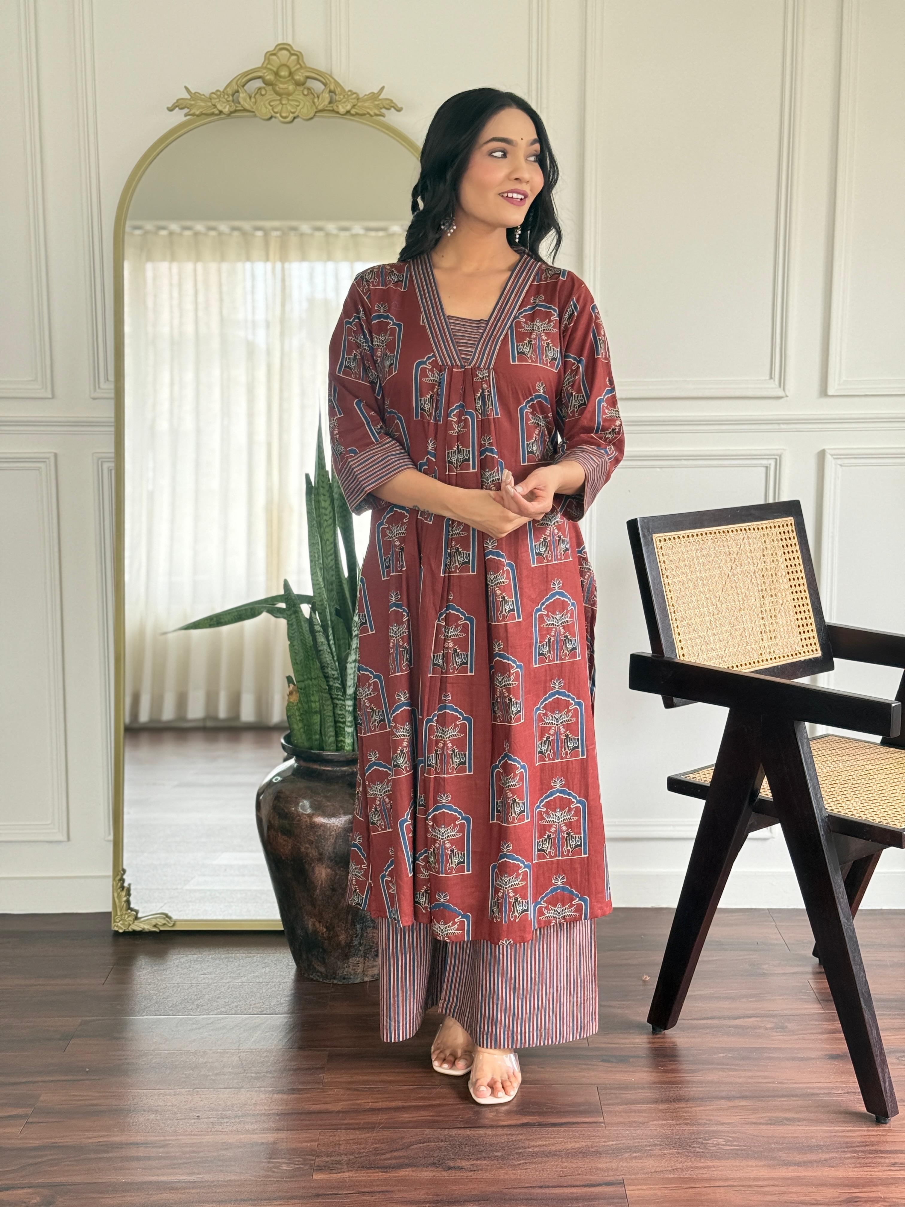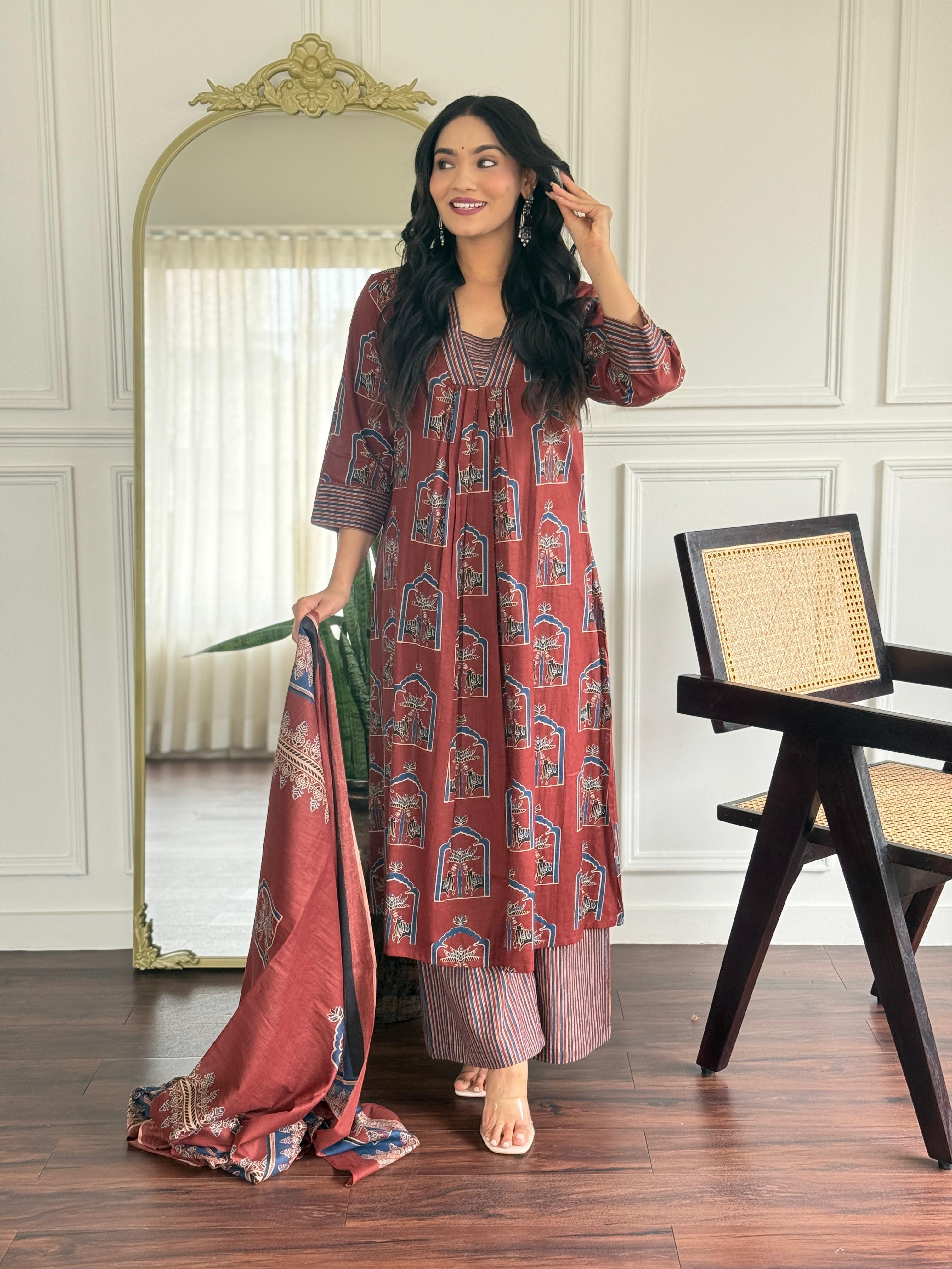Elevate your festive wardrobe with this striking red floral suit set, expertly crafted for traditional celebrations. The coordinated kurta, pant, and dupatta ensemble combines timeless ethnic aesthetics with refined simplicity, making it an ideal choice for weddings, festivals, and special occasions. Perfect for those seeking understated elegance without compromising on style.