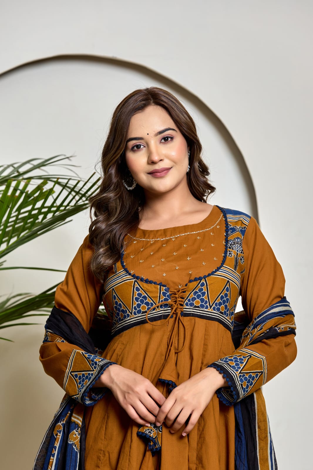 Pure Cotton Three-Piece Anarkali Suit Set with Handwork | GYSY Sarees
